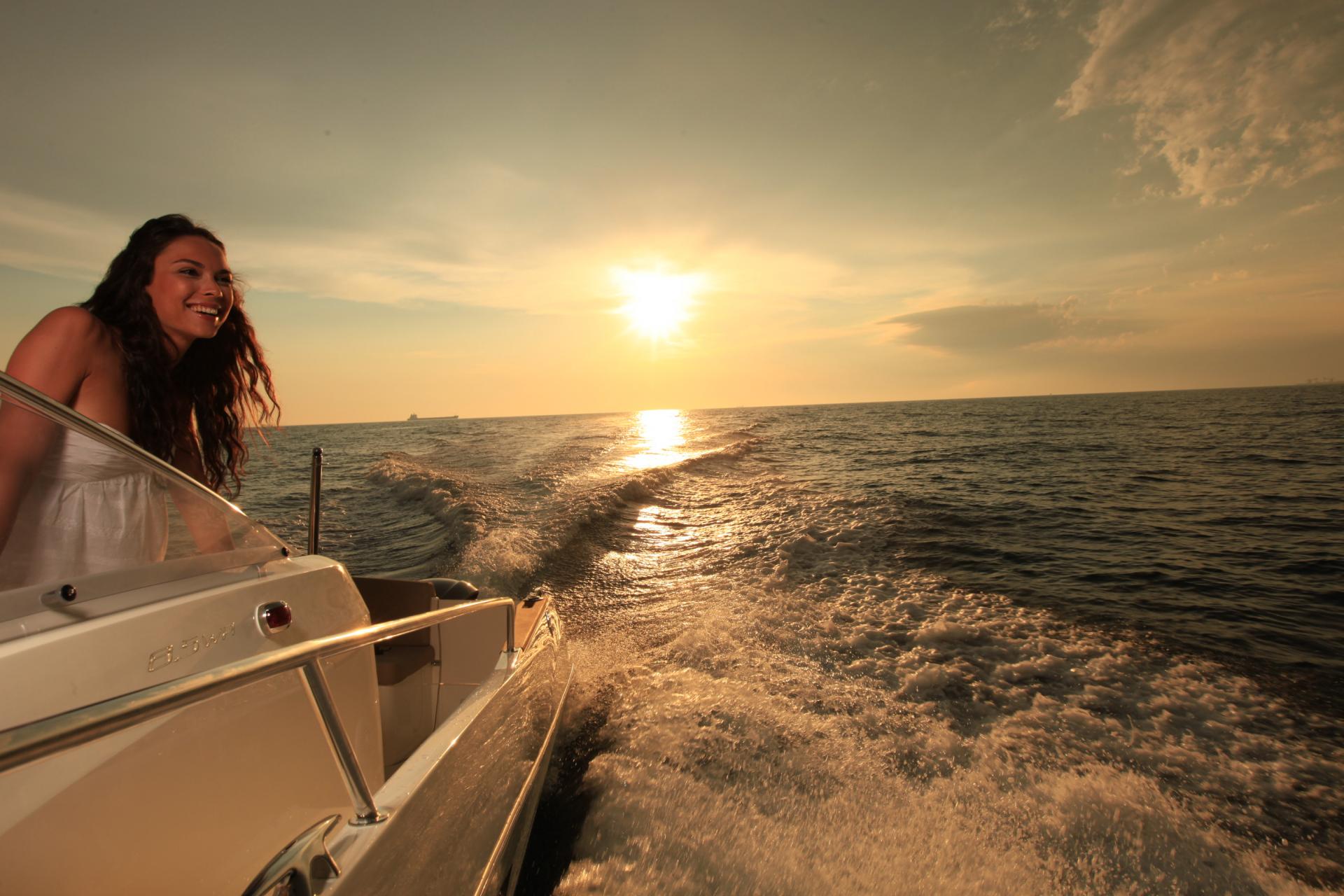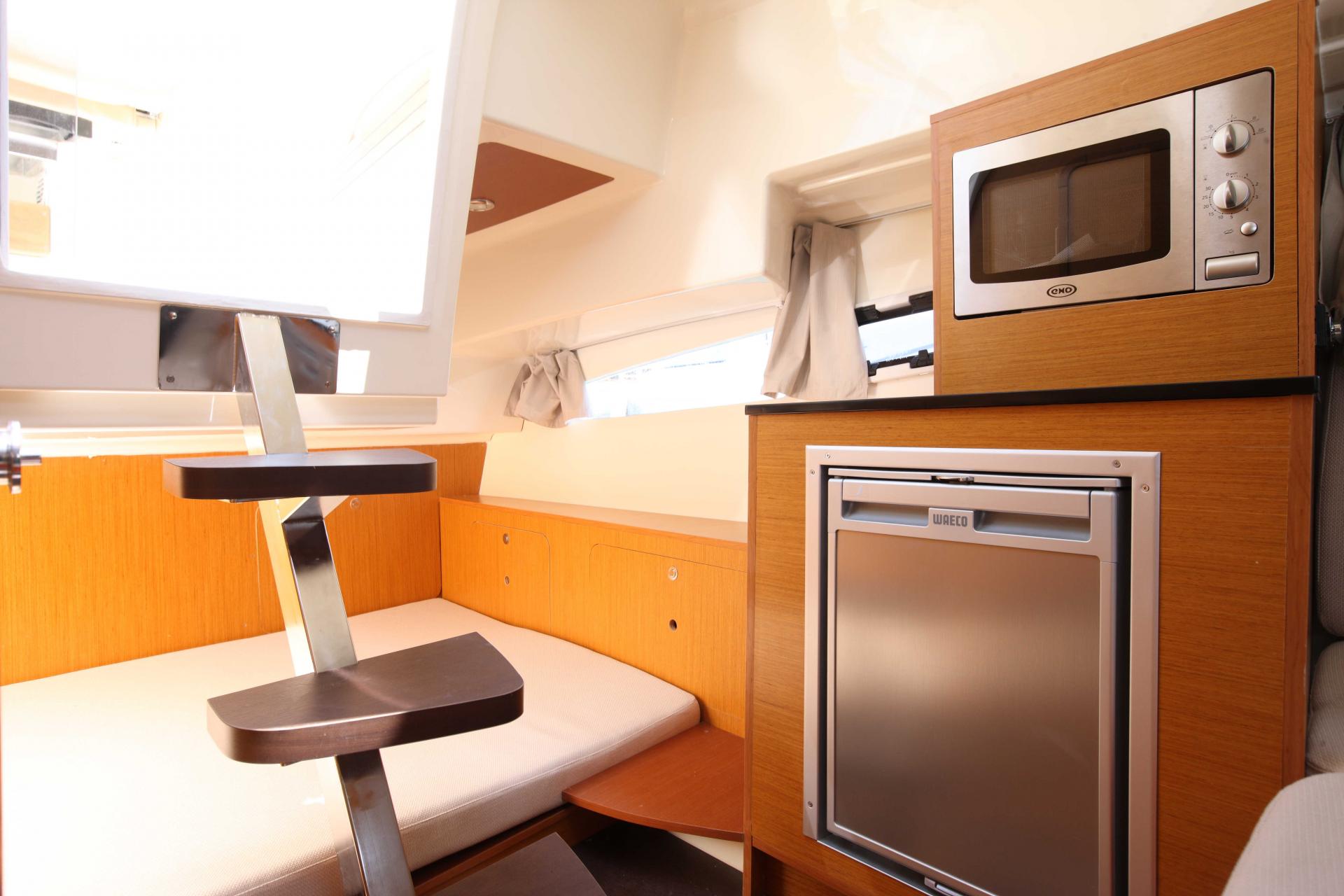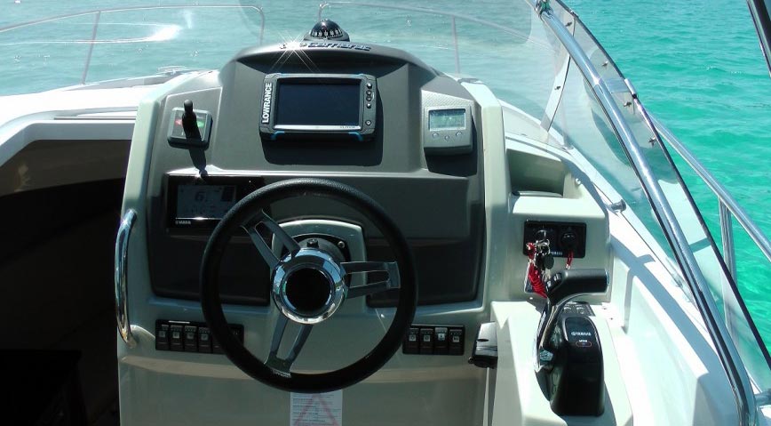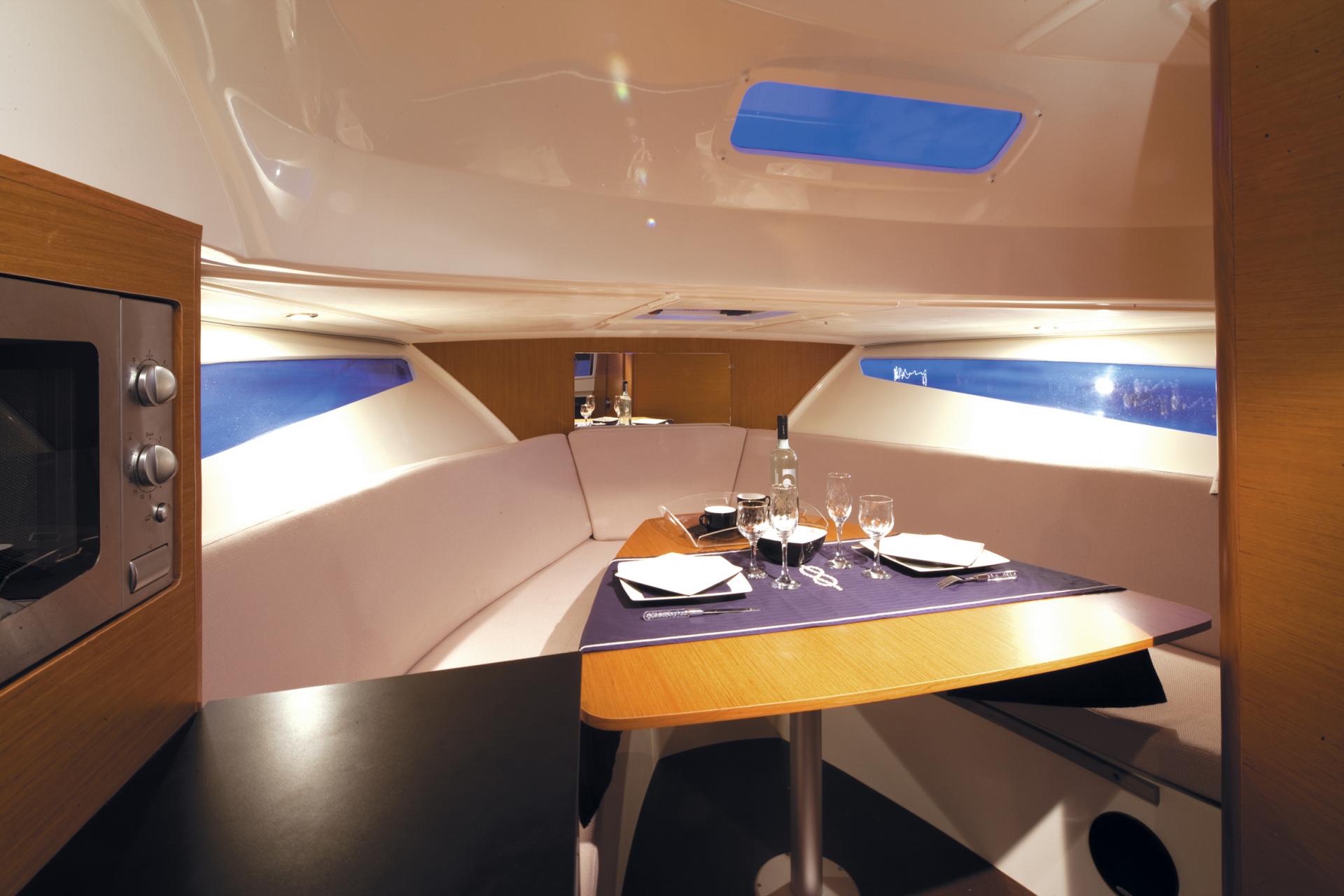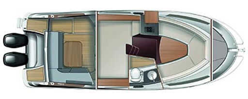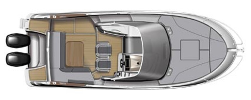 Dieses Walk-Around-Modell bietet im Freien ein großes hindernisfreies Cockpit mit Steuerstand für zwei sowie Komfort und Entspannung dank eines großen L-förmigen Sofas. Auf dem Vorschiff lädt eine schicke Sonnenliege zum Entspannen ein. Über die zwei Heckplattformen mit Badeleiter gelangt man an Bord. Eine Außenpantry an Backbord mit Spülbecken und Herd und zahlreiche Staumöglichkeiten lassen auch 8 Personen einen unvergesslichen Tag in den schönsten Buchten erleben.